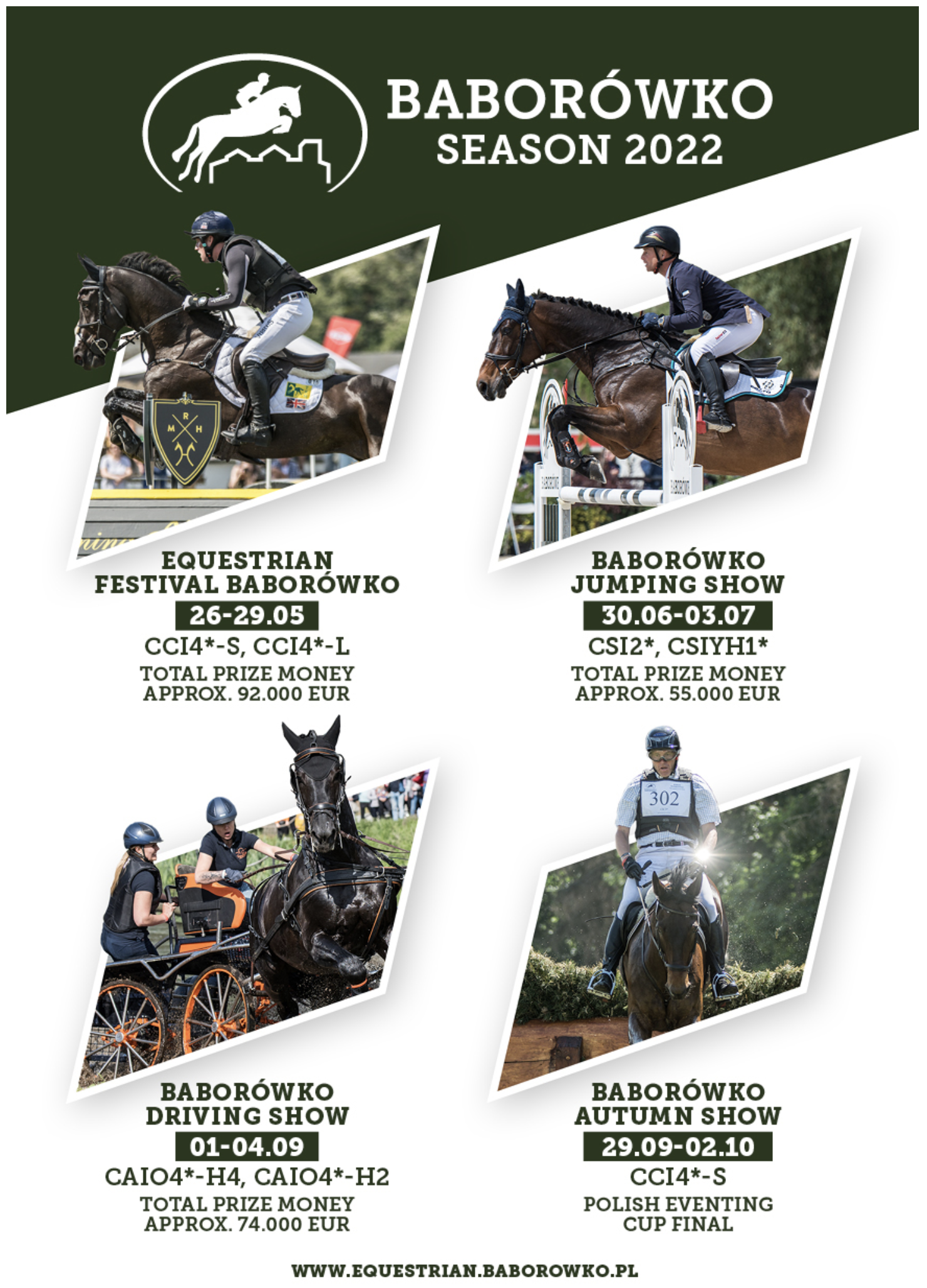 Die Saison beginnt mit dem Klassiker der Vielseitigkeitsshow Baborówko – dem Equestrian Festival Baborówko, das vom 26. bis 29. Mai 2022 stattfindet. Es ist die 15. Ausgabe dieser Veranstaltung, an der in den Vorjahren Weltstars des Pferdesports wie Oliver Townend ( GBR), Michael Jung (GER) und Ingrid Klimke (GER) teilnahmen. Im Jahr 2022 werden die Athleten unter anderem in den Klassen CCI4*-L und CCI4*-S antreten, und im Rahmen letzterer werden wieder die Polnischen Meisterschaften der Senioren im Vielseitigkeitsreiten ausgetragen. Der Gesamtpool der Geldpreise beläuft sich auf 92.000 Euro, womit diese Veranstaltung erneut zu den Top 10 der am bestdotierten Vielseitigkeitsprüfungen der Welt zählt.