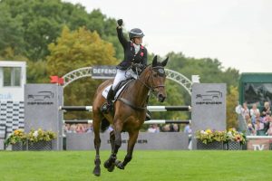 Nachdem im ersten Teil der Geländestrecke alles super aussah, kam D’Accord FRH in der Landung des Sprunges 14, den Burghley House Turrets – einem hochweiten Buschoxer, der eher als ,,Füllsprung“ bzw. ,,Confidence“ Booster eingestuft wurde, leicht ins Straucheln und auch sein Reiter Christoph Wahler kam dadurch kurz aus dem Gleichgewicht. Während D’Accord sich schnell wieder fing und zunächst unbeirrt weitergaloppierte, konnte Christoph sich nicht im Sattel halten und stürzte. Glücklicherweise war er schnell wieder auf den Beinen und joggte seinem weiterhin frisch galoppierenden Hannoveraner hinterher. Dieser schien nach einigen Metern auch zu bemerken, dass er etwas verloren hat und parierte durch, um seinen Reiter wieder in Empfang zu nehmen. Wie Schade! Die beiden haben im Mai mit einer phänomenalen Nullrunde in Badminton bereits bewiesen, dass sie den schwierigsten Kursen gewachsen sind und hatten in Burghley mit einem Personal Best in der 5*-Dressur (-27,2) bereits einen guten Grundstein gelegt.