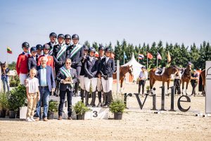 Nach der Dressur und dem Gelände hatte das deutsche Nations Cup Team noch in Lauerstellung hinter den US-Amerikanern auf dem zweiten Platz gelegen. Dank starker Ritte im anspruchsvollen abschließenden Parcours konnte das deutsche Quartett unter der Leitung von Dr. Annette Wyrwoll die bis dato Führenden noch überholen und sich bereits zum dritten Mal in Folge den Sieg in der Teamwertung in Arville sichern. Auch in der Einzelwertung lief es rund für die deutschen Starterpaare: Calvin Böckmann und Anna Siemer konnten sich mit Rang 2 und 3 Plätze auf dem Podium sichern. Gleich sieben weitere deutsche Paare platzierten sich ebenfalls in der Einzelwertung der CCIO4*-NC-S. Zudem konnte Brandon Schäfer-Gehrau nach seinem Sieg in der CCI2*-S am Samstag, auch noch den ersten Platz in der CCI3*-S belegen.