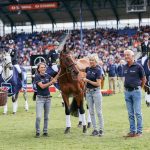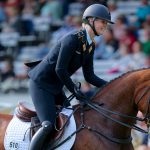 Das Wetter am Aachener Geländetag passte sich am Samstag an das Partnerland Großbritannien an und es zeigte sich den ganzen Vormittag ein wolkenverhangener Himmel zusammen mit rheinischem Landregen. Das alles störte die Besucher nicht und zahlreiche Zuschauer pilgerten mit Schirmen und Regenmänteln bewaffnet durch das Gelände. Auch das Stadion war mit 35.000 Zuschauern nahezu vollständig gefüllt. Das Publikum vor Ort und vor den Bildschirmen zuhause bekam spannenden und modernen Vielseitigkeitssport mit vielen tollen Paaren zu sehen. Jedoch machte der anhaltende Regen der Bodenqualität etwas zu schaffen, sodass die ohnehin in Aachen meist knapp bemessene Bestzeit heute keines der 44 Paare einhalten konnte. Die schnellsten Runden drehten die spätere Siegerin Yasmin Ingham (GBR) mit ihrem 12-jährigen Banzai du Loir und Christoph Wahler mit dem ebenfalls sehr erfahrenen Carjatan S. Beide kamen vier Sekunden oberhalb der erlaubten Zeit ins Ziel. Christoph arbeitete sich mit seinem WM-Partner von Platz 26 nach der Dressur also bis auf den vierten Platz vor und präsentierte sich einmal mehr als verlässlicher Teamreiter, der entscheidend zum Sieg der deutschen Mannschaft beitrug: ,,Er mag die ganz großen Dressurstadien mit Atmosphäre nicht so gerne, das hat sich gestern wieder einmal gezeigt, aber wir kennen uns sehr gut, sodass ich an den Sprüngen im Gelände einige Risiken eingehen konnte, um am Ende fast in die Zeit zu reiten.“