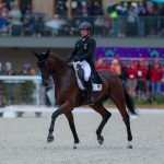 Es war ein mehr als spannender Nachmittag im französischen Haras du Pin auf der um knapp zwei Minuten verkürzten Geländestrecke. Zahlreiche, der Sprache nach zu urteilen vor allem französische Fans, säumten die Geländestrecke und feuerten die Teilnehmenden und vor allem die Reiter des Gastgeberlandes lautstark an. Die Entscheidung der Entschärfung des Kurses nach den Regenfällen erwies sich als goldrichtig, denn selbst bei der nun ,,nur noch“ 4730 Meter langen Geländestrecke kamen einige Pferde, trotz der stetigen Bemühungen der Veranstalter die Verhältnisse so gut wie möglich zu halten, konditionell an ihre Grenzen. Der durch den Regen aufgeweichte Boden zehrte an den Kraftreserven der Vierbeiner. 39 der ursprünglich 55 gestarteten Paare kamen im Ziel an, zwei Pferde wurden vor dem Gelände zurückgezogen. Insgesamt stürzten sechs Reiter und drei Pferde kamen zu Fall. Jedoch gab es auch einige Pferde denen die Bodenverhältnisse überhaupt nichts auszumachen schienen, allen voran dem 11-jährigen Grafenstolz-Sohn Lordships Graffalo, der gemeinsam mit seiner zierlichen Reiterin Rosalind Canter als vorletztes Starterpaar eine Lehrbuchrunde über die insgesamt 29 Hindernisse drehte und als einziges Pferd innerhalb der erlaubten Bestzeit blieb. Er führt nun mit seinem Dressurergebnis von -21,3 Punkten und mit über zwei Springfehlern Vorsprung vor seinem Teamkollegen Vendredi Biats vorgestellt von Kitty King. Sie belegt mit der drittschnellsten Geländerunde des Tages und -30,8 Punkten aktuell den Rang der morgen nach dem Springen die Silbermedaille bedeuten würde. Jedoch folgt ihr mit -34,6 Punkten und nicht einmal einem Springfehler Abstand Sandra Auffarth die mit ihrem ,,Mat“ eine mutige und beherzte Geländerunde drehte. Sandra kämpfte den ganzen Kurs über, ließ keine Sekunde liegen und man sah den beiden förmlich an, dass sie sich in- und auswendig kennen und eben eine richtige Einheit im Gelände bilden. Lediglich mit sechs Zeitfehlern und der viertschnellsten Zeit des Tages konnten sie freudestrahlend die Ziellinie überqueren.