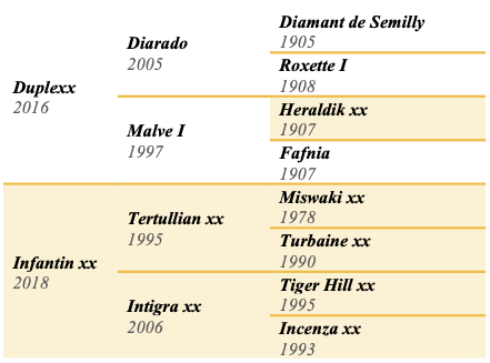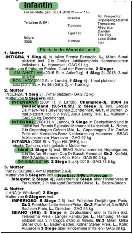 Brachte überragende Rennpferde, von denen Intendant, Integral und Ideal alle auch in der Warmblutzucht waren. Innenminister glänzt mit vielversprechenden Fohlen, die ältesten jetzt 3-jährig.