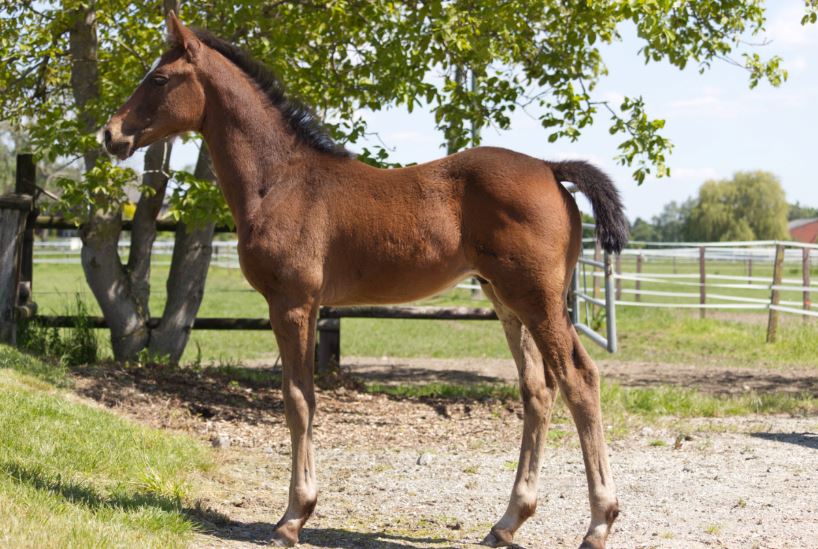 Karango ist ein sich sehr auffällig bewegendes Hengstfohlen, der jetzt schon erkennen lässt, dass er später dem modernen Vielseitigkeitspferdetyp entspricht. Sein Vater Karajan ist mittlerweile allseits als überdurchschnittlicher Vererber bekannt und mit Marco Kutscher auf dem Weg in den großen Sport.