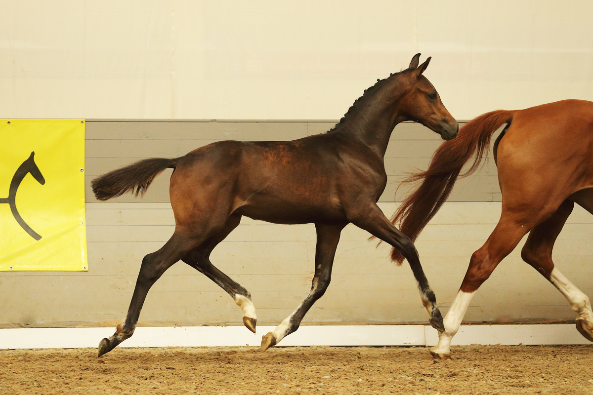 Das Spitzendressurhengstfohlen, Katalog-Nr. 1 – ′′Discussion′′ – das mit viel Habitus, aktivem Hinterbein und sich mit und durch den Körper bewegen konnte, besonders viele Kaufinteressenten fand. Abstammung von Dynamic Dream – Dancier – Worldly aus der Zucht von Natalie Kapp aus Bremen.