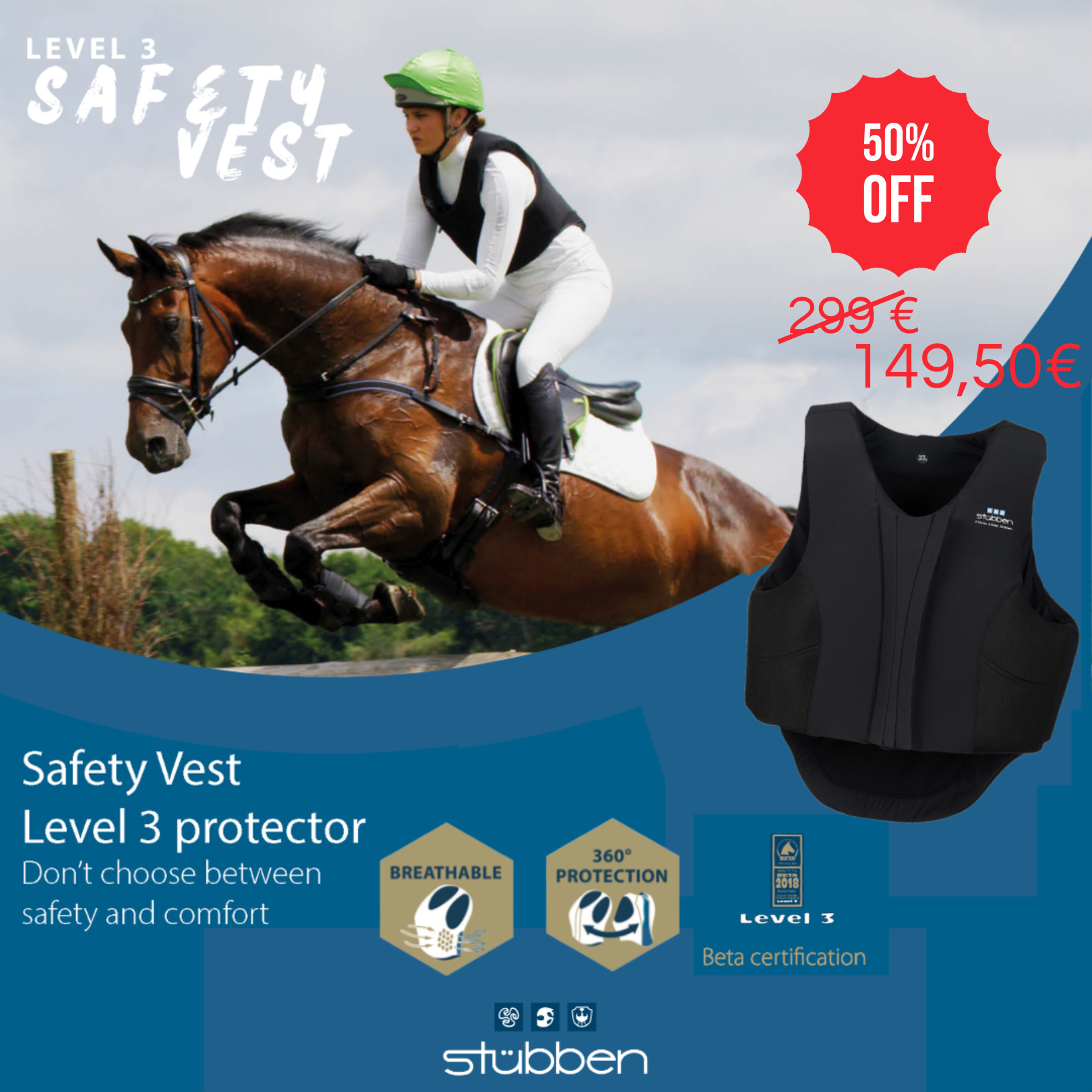 Beim END OF SEASON Sale ist die Stübben Sicherheitsweste Level 3 um 50% reduziert (von 299,00 € auf 149,50 €). Dabei ist sie in drei Ausführungen erhältlich: Junior, Slim Fit und Regular.
